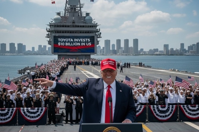 트럼프는 4.5에이커 규모의 핵추진 항공모함 위에서 선원들을 향해 말했다. "방금 일 총리로부터 토요타가 미국 전역에 100억 달러 규모의 자동차 공장을 건설할 것이라는 말을 들었습니다." 그는 즉시 결론을 내렸다. "그래서 그게 토요타입니다. 그러니 나가서 토요타를 사세요."