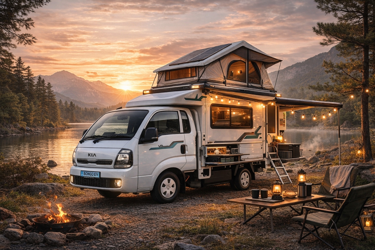 다음은 성격이 완전히 다른 1톤 상용 베이스형이다. 이 장르에선 현대 포터와 기아 봉고를 따로 경쟁시키기보다, 하나의 세계로 묶는 편이 더 정확하다. 그중 대표로 세우기 좋은 차는 기아 봉고 III EV다. 기본형은 전장 5115mm, 전폭 1740mm, 전고 1995mm에 60.4kWh 배터리와 135kW 모터를 갖췄고, 윙바디나 양문형 미닫이탑차 같은 특장 모델은 전고가 2,670mm에 이르며 적재함 높이가 1800mm 수준까지 확보된다. 이쯤 되면 더이상 ‘차박’이 아니라, 아예 작은 집을 올릴 수 있는 플랫폼에 가깝다. 이 타입의 가장 큰 장점은 자유도다. 가족이 누워 잘 침대를 넣고, 수납장을 짜고, 외부 샤워나 간이 주방, 배터리 팩, 태양광까지 올리려면 결국 공간과 구조가 우선이다. 그런 점에서 1톤 상용 베이스는 가장 ‘정통 캠핑카다운’ 해법이다. 대신 희생도 분명하다. 승용차 같은 정숙성과 승차감, 세련된 일상성은 기대하기 어렵다. 이 차들은 어디까지나 “좋은 자동차”라기보다 “좋은 베이스캠프”다. 여행지에 도착해서 비로소 진가가 드러나는 스타일이다.