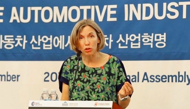 르노삼성이 변화하는 자동차산업에 선제적으로 대응한다. 르노-닛산-미쓰비시 얼라이언스의 소피 슈미틀린 이사가 포롬에서 자동차산업의 세 가지 핵심 요소에 대해 발표하고 있다. 사진=르노삼성