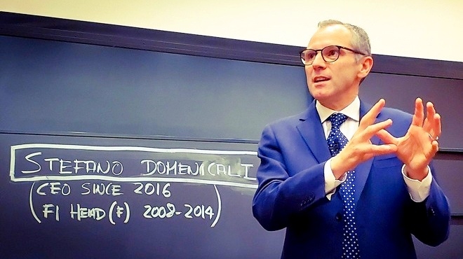 람보르기니 CEO 스테파노 도메니칼리가 하버드 비즈니스 스쿨 경영자 교육 프로그램에서 강연하고 있다. 사진=람보르기니