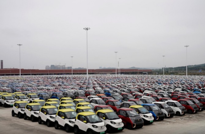 이미지 확대보기지난해 2월 28일(현지시간) 미국 GM과 중국 바오준자동차가 합작생산한 전기차 바오준 E100 및 E200이 중국 광시좡족자치구 류저우의 자동차야적장에 빼곡하다. 사진=로이터