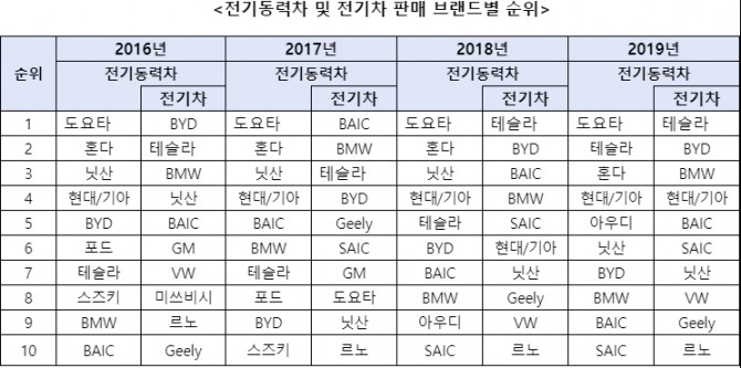 현대·기아차는 2017년까지만 해도 10위권 바깥에 머물렀으나 전기차 라인업(제품군)을 꾸준히 늘리며 2018년 6위로 오른 데 이어 '톱5'에 이름을 올리게 됐다.