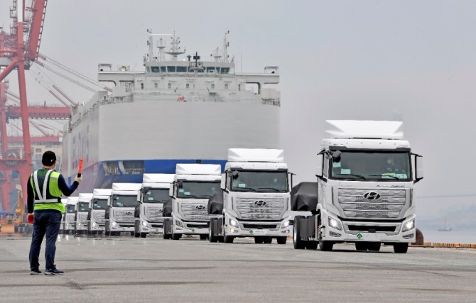 이미지 확대보기현대자동차가 세계 최초로 양산을 시작한 대형 수소전기트럭 '엑시언트'가 지난 7월 스위스로 향하기 위해 선적 중이다. 사진=현대차
