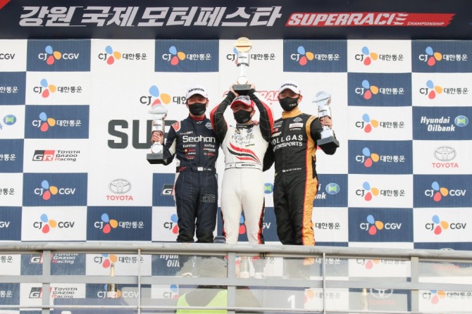 이미지 확대보기금호타이어 엑스타레이싱팀 소속 정의철 선수(가운데)가 지난 10월 25일 강원 인제군 인제스피디움에서 열린 '2020 CJ대한통운 슈퍼레이스 챔피언십' 6라운드 슈퍼6000 클래스 결승에서 포디움 정상에 올랐다. 사진=금호타이어 금호타이어가 지난 10월 폐막한 국내 최대 모터스포츠 대회 'CJ대한통운 슈퍼레이스 챔피업십'에서 종합 우승을 거둔 기념으로 타이어 제품 할인 등 이벤트를 진행한다.