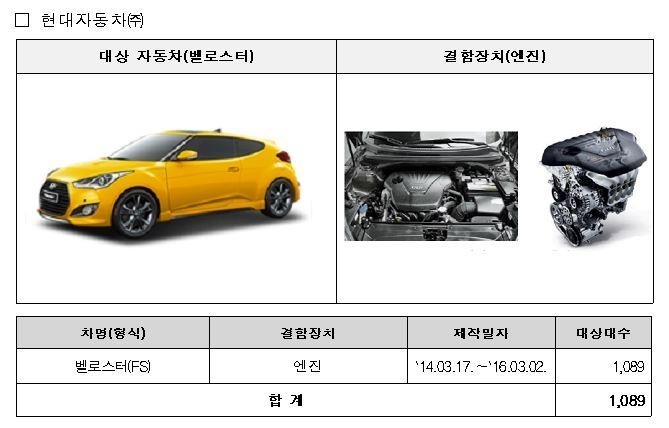 현대차에서 제작·판매한 벨로스터 1089대는 엔진 내부 일부 부품이 마모 등 손상돼 간헐적으로 주행 중 시동이 꺼지거나 화재가 발생할 가능성이 확인됐다. 이에 따라 예방 차원에서 리콜에 들어간다고 국토부는 설명했다.