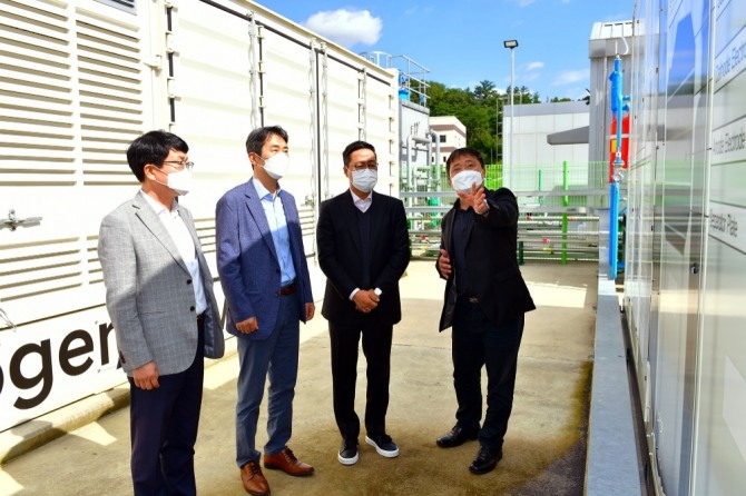 이번 실증은 현대차·기아의 500kW(킬로와트시)급 고분자전해질 연료전지와 두산퓨얼셀의 440kW급 '인산형 연료전지'가 함께 적용돼 서로 다른 방식의 연료전지 시스템을 조합해 운영한다는 특징을 가진다.