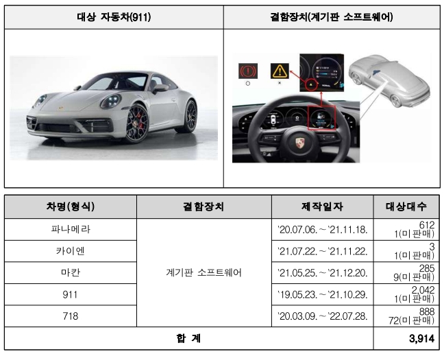 포르쉐코리아에서 수입, 판매한 911 등 다섯 개 차종 3914대(판매이전 포함)는 계기판 소프트웨어의 오류로 제동장치 고장 자동표시 식별부호가 안전기준에 부적합한 것으로 확인돼 자발적 시정조치에 들어간다. 포르쉐코리아는 추후 시정률 등을 감안해 과징금을 부과할 계획이다.