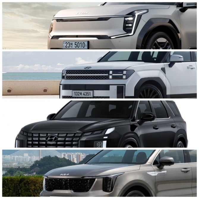 이미지 확대보기(위부터) 기아 EV9, 현대차 디 올 뉴 싼타페, 현대차 팰리세이드, 기아 올 뉴 쏘렌토 사진=현대자동차, 기아