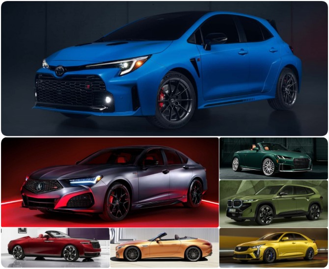 토요타 2024 GR 코롤라-블루 플레임(위), (아래, 좌측 상단부터 시계방향으로) 어큐라 TLX 타입 S PMC 에디션-고담 그레이, 아우디 TT-굿우드 그린 펄, BMW XM-어반 그린, 캐딜락 CT4-V-사이버 옐로우, 메르세데스-벤츠-오렌지 플레임 메탈릭, 롤스로이스 라 로즈 노이어 드롭 테일. 사진=각 사
