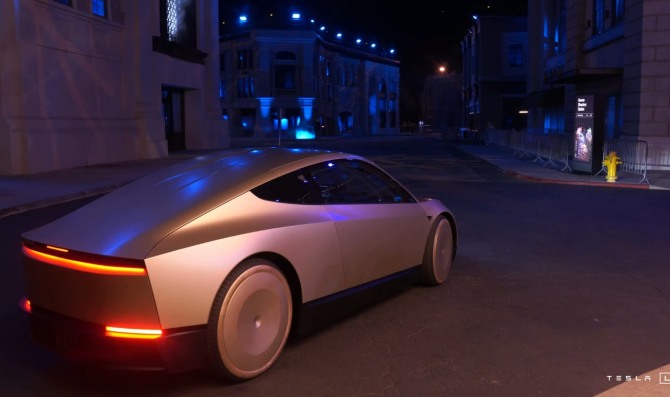 ‘We, Robot 이벤트’가 시작되자, 테슬라의 CEO 일론 머스크는 나비 문이 달린 반짝이는 미래형 차량에 올라타 무대로 빠르게 올라갔다. 사이버캡은 앞뒤에 매끈한 라이트 바와 깊은 접시 모양의 림을 보였다.