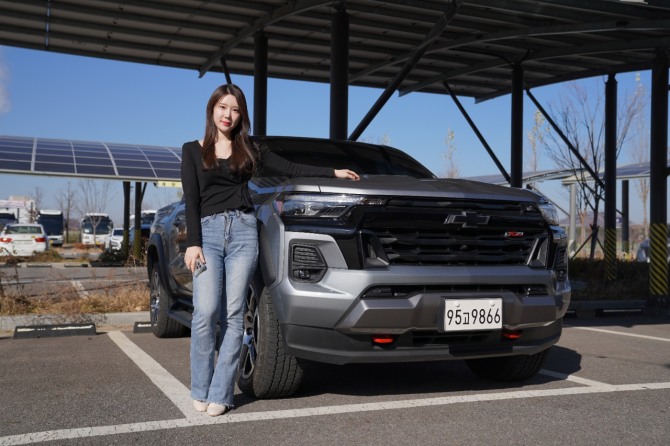 이미지 확대보기김예솔 아나운서가 신형 쉐보레 콜로라도 옆에서 기념 촬영을 하고 있다. 사진=글로벌이코노믹