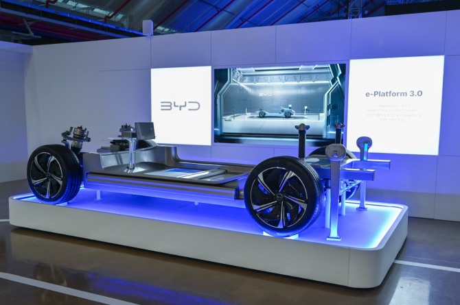 이미지 확대보기BYD코리아의 전시물이 e-플랫폼 기술 설명을 시연하고 있다. 사진=BYD코리아
