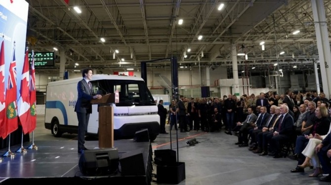 이미지 확대보기저스틴 트뤼도 총리가 캐나다 최초의 전기자동차 제조 공장인 GM의 온타리오주 인저솔에서 연설하고 있다. 사진=GM