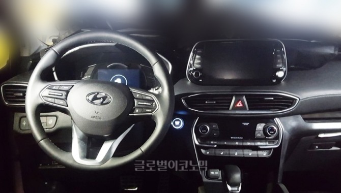 신형 싼타페의 센터페시아는 모니터, 송풍구, 제어버튼 순서로 코나와 동일한 배열을 이뤘으나 코나의 동그란 디자인 대신 엣지 포인트로 차별화를 줬다.