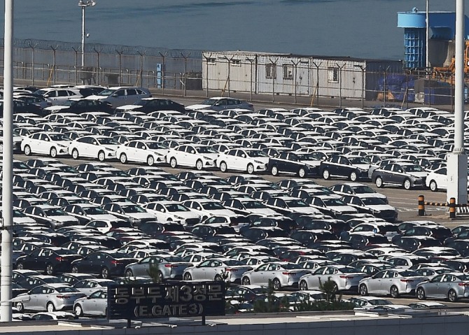자동차들이 경기 평택항에서 수출을 위해 선적을 기다리고 있다. 사진=뉴시스