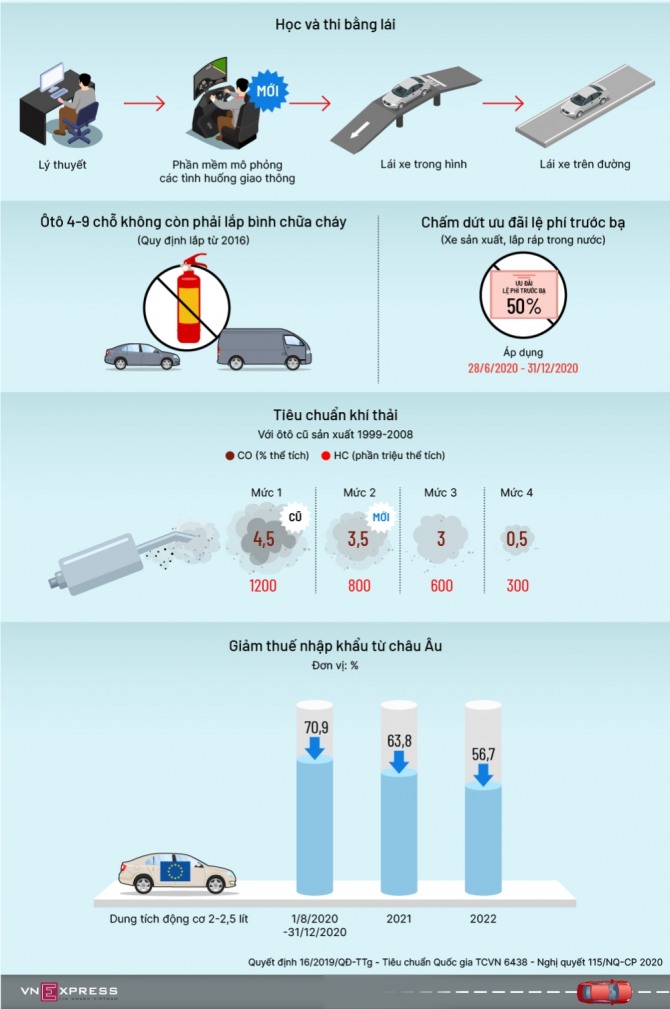 베트남에서는 올해부터, 가상 운전 시뮬레이션 교육을 받아야 면허를 취득할 수 있다. 국내산 자동차 구매시 등록세 감면을 중단하고, 4인승 차량에 의무적으로 소화기를 설치하지 않아도 된다.