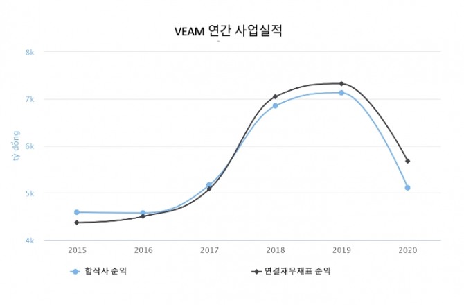 그러나 제휴회사 및 합작사에서 발생한 수익은 28%에 해당하는 2조동 이상 감소해 VEAM의 세전및 세후 이익은 크게 하락했다.