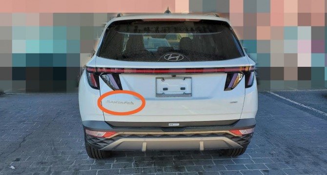 전면과 측면에서는 아무런 문제점을 찾아볼 수 없었다. 문제는 차량 뒤쪽이었다. 해당 사진에는 투싼 후면부에 상위 차종인 '싼타페' 엠블럼이 부착된 장면이 담겼다.