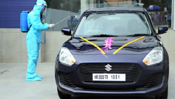 한 마루티스즈키 판매점의 직원이 승용차 인도전에 코로나19 방역조치를 하고 있는 모습. 사진=닛케이 캡처