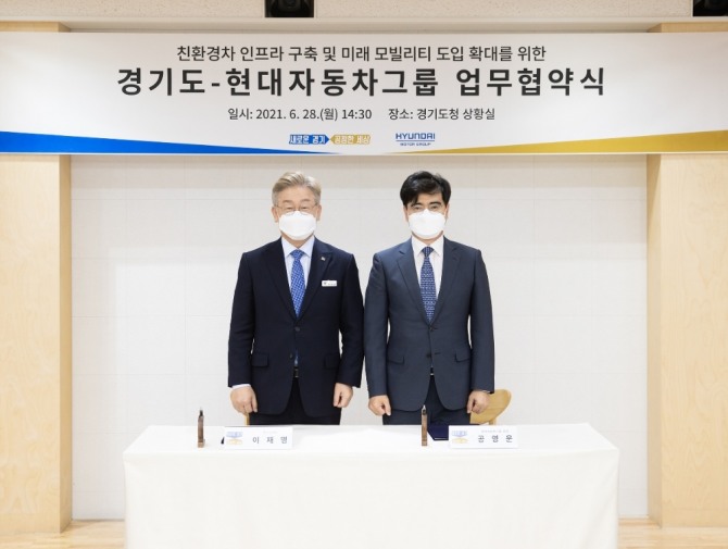 경기도와 현대자동차그룹은 28일 오후 경기도청 상황실에서 '친환경차 인프라 구축과 미래 모빌리티 도입 확대를 위한 경기도-현대자동차그룹 업무협약'을 체결했다.