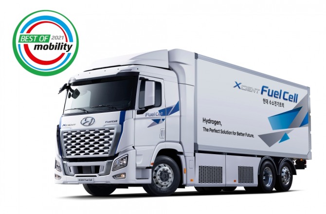 이미지 확대보기현대차 수소트럭 엑시언트가 'IAA 모빌리티 2021'에서 베스트 모빌리티 상을 수상했다. 사진=현대차