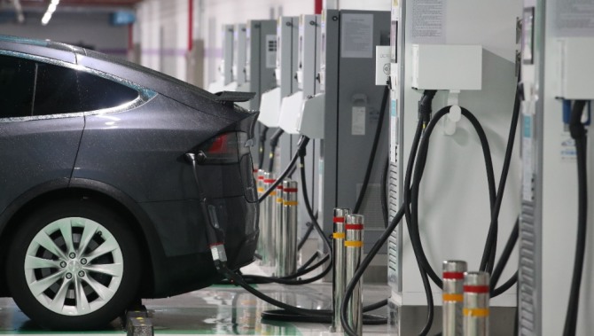 이미지 확대보기전기자동차가 지하 주차장에 구비된 전기차 전용 충전소에서 충전작업을 하고 있다. 사진=뉴시스