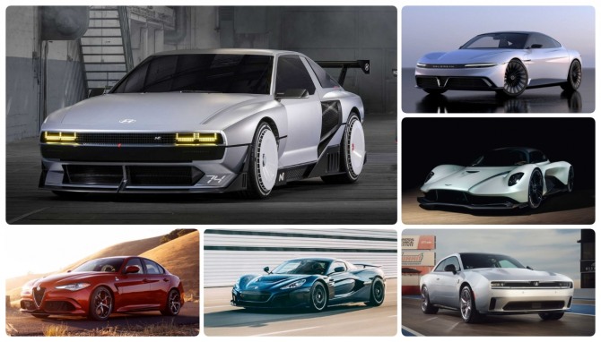이미지 확대보기(좌측 상단부터 시계방향) 현대 N 비전 74, 드로리안 알파5, 애스턴마틴 발할라, 닷지 차저 데이토나 SRT EV, 부가티 리막, 알파로메오 줄리아 콰트로포글리오 EV 사진=각사