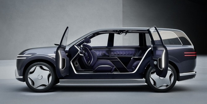 가장 눈길을 끄는 것은 단연 ‘코치 도어’다. B필러를 과감히 삭제하고 앞뒷문이 서로 마주 보며 열리는 이 방식은 롤스로이스 등 극소수 럭셔리카의 전유물이었다. 현대차그룹의 차세대 전기차 플랫폼 ‘eM’을 기반으로 하여, 거주성은 물론 자율주행과 커넥티비티 기술에서도 압도적인 진보를 보여줄 것으로 기대된다. 그야말로 ‘달리는 퍼스트 클래스’로서 벤츠 EQS SUV, 랜드로버 레인지로버와 직접 경쟁하게 된다.