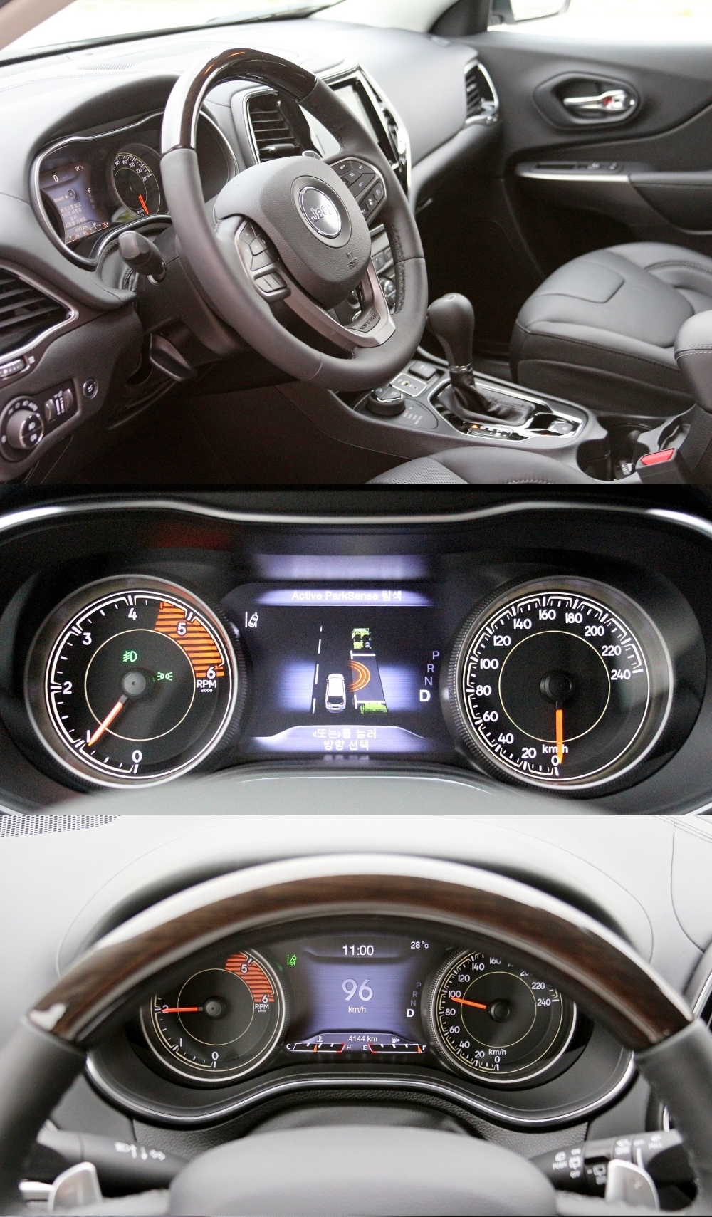 이미지 확대보기신형 체로키 오버랜드 1열. 고급감이 곳곳에 묻어 있다. 계기판에는 각종 차량의 안전장치 작동 여부를 확인할 수 있어 운전 편의성이 크게 개선됐다. 사진= 정수남 기자