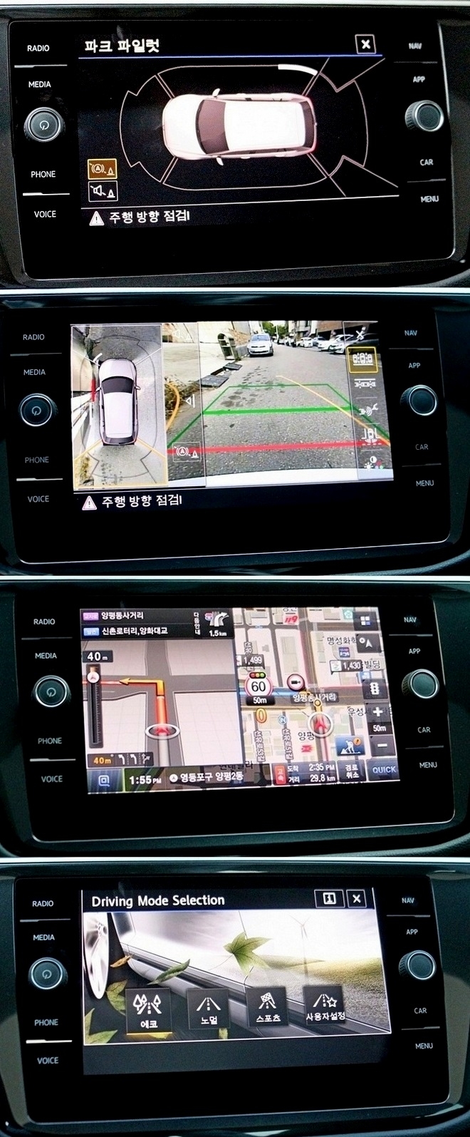 이미지 확대보기최근 폭스바겐 차량에 기본으로 실리고 있는 파크 파일럿은 주차 과정에서 발생하는 안전 사고를 획기적으로 줄여준다. 8인치 모니터에는 내비게이션 지도와 함께 주행 모드 등 차량 조작 상황이 실시간으로 보여진다. 사진=정수남 기자
