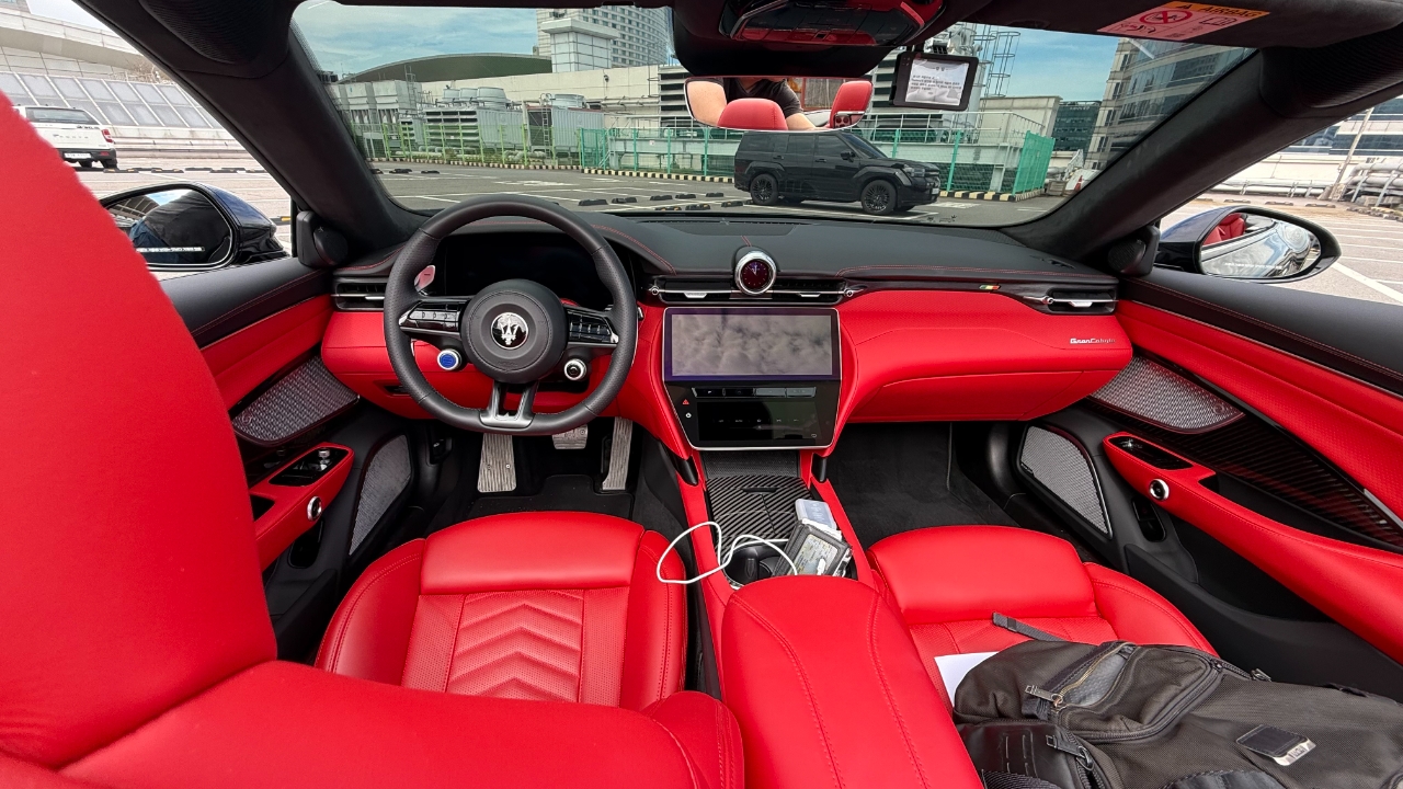 실내에 들어서면 이탈리아 장인정신을 느낄 수 있는 고급스러운 소재와 디자인이 펼쳐진다. 대시보드와 시트, 도어 트림 등 손이 닿는 모든 곳에 아낌없이 가죽을 둘러 풍부한 질감을 전하며, 세밀한 스티치와 메탈 장식이 어우러져 “만지고 싶은” 충동을 일으킨다. 시트는 넓고 편안해 장거리 투어에도 무리가 없겠다는 생각이 들었다. 최신 마세라티 인포테인먼트 시스템이 12.3인치 메인 스크린과 8.8인치 보조 스크린의 듀얼 디스플레이 형태로 자리잡았다. 공조 조작부터 글로브박스 열기, 심지어 지붕 개폐까지 거의 모든 기능이 터치패널로 통합된 것이 인상적이다. 하지만, 시스템의 사용법은 인상적인 이미지를 주지는 않는다.