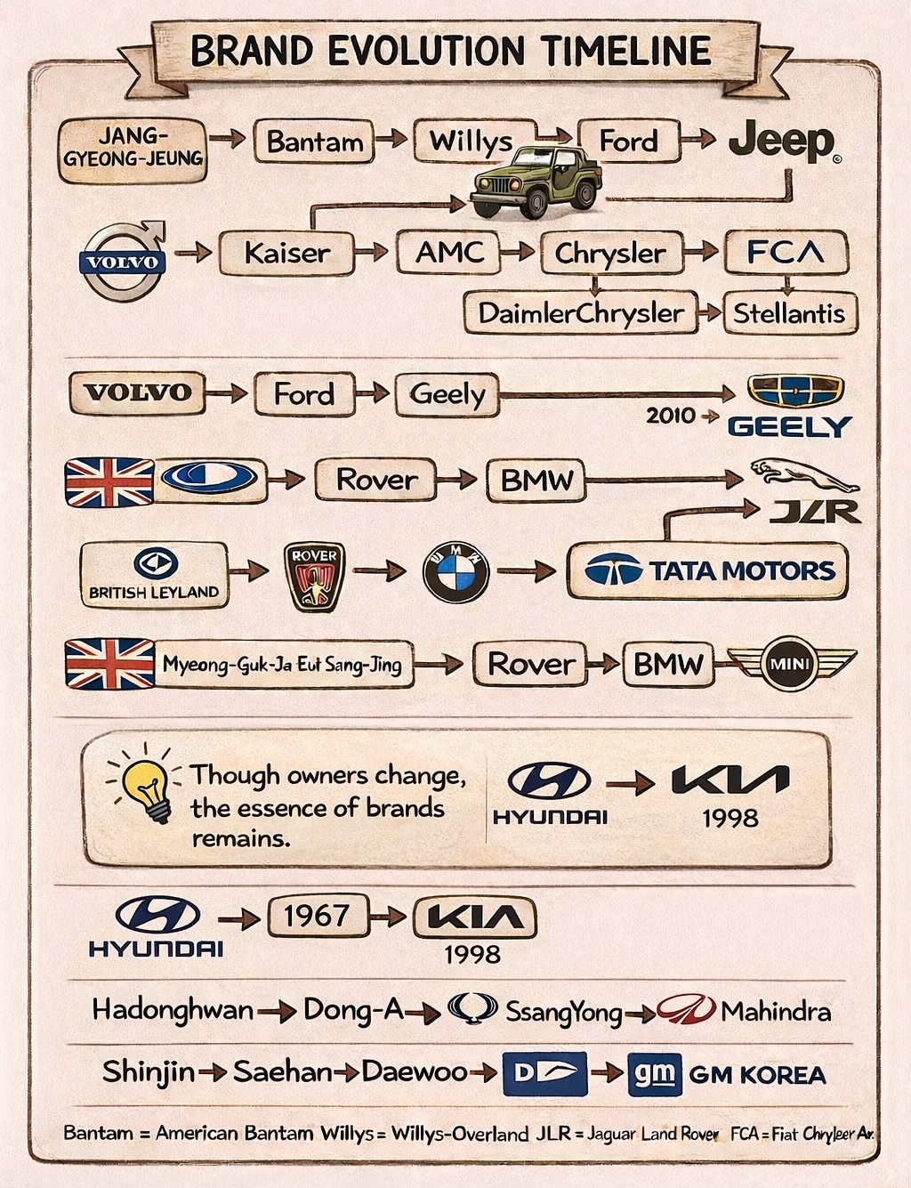 지프는 격동의 변천사를 가장 상징적으로 보여주는 브랜드다. 지프의 출발은 2차 세계대전 당시 미군의 경량 정찰차 개발 사업이었다. 당시 미국 정부의 요구에 응한 회사는 아메리칸 밴텀, 윌리스-오버랜드, 포드였고, 세 회사가 각각 시제품을 내놓았다. 이후 미군은 윌리스 차량을 주력 생산 기반으로 선택했고, 포드도 전시 대량 생산에 참여했다. 전쟁이 끝난 뒤 ‘지프’는 군용차의 이름을 넘어 민간용 오프로더의 상징으로 확장됐다. 이후 윌리스는 1953년 카이저에 매각됐고, 1970년에는 AMC로, 1987년에는 크라이슬러로 넘어갔다. 크라이슬러가 피아트와 합쳐 FCA가 된 뒤, 지금 지프는 스텔란티스 산하 핵심 브랜드가 됐다. 한 브랜드가 전쟁, 산업 재편, 초국적 합병을 모두 거쳐 살아남은 셈이다.