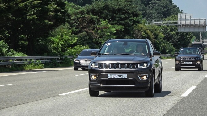 그랜드 체로키를 기반으로 제작된 컴패스는 콤팩트 SUV이다. 앞모습은 그릴에 있는 네모가 직사각형에서 정사각형으로 변했다. 주간주행등이 추가되고 또렷해졌다. 에어 인테이크 홀에도 벌집 모양의 망이 생겨 그릴과 통일감을 이룬다.