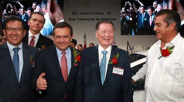 이미지 확대보기정몽구 현대자동차그룹 회장(오른쪽 두번째)이 2016년 11월 멕시코 누에보레온주 페스케리아시에서 열린 '기아차 멕시코공장 준공식'에서 관계자들과 K3(현지명 포르테)에 서명 후 하이메 로드리게스 주지사(오른쪽 첫번째) 등과 기념 촬영을 하고 있다. 사진=현대차그룹