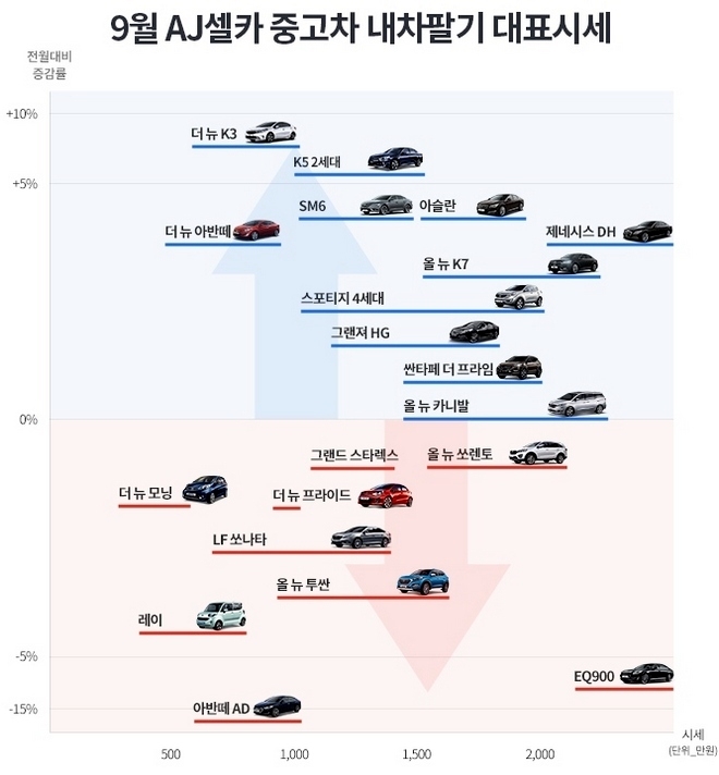 AJ셀카의 중고차 판매 서비스인 내차팔기를 통해 판매가 완료된 차량 가운데 거래량이 많은 상위 20개 모델의 평균 시세를 의미하는 내차팔기 대표시세는 9월 평균 1% 감소한 것으로 파악됐다.