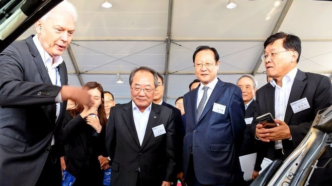 이미지 확대보기알버트 비어만(왼쪽 첫번째) 사장이 협력사 선행 신기술 전시물을 살펴보고 있다. 사진=현대차그룹