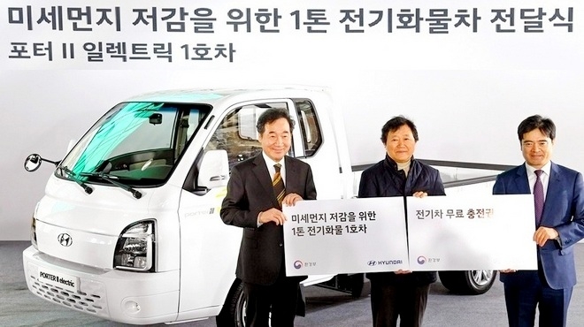 이미지 확대보기(왼쪽부터)이낙연 국무총리, 박내옥 씨, 공영운 현대차 사장이 기념사진을 찍고 있다. 사진=현대차 현대자동차가 국산 상용자동차에서도 전기차(EV) 시대를 열었다. 국산차 최초의 친환경 전기차 소형 트럭 포터II 일렉트릭 1호차를 17일 고객에게 전달한 것이다.