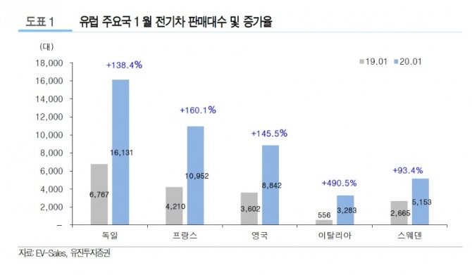 16일 유진투자증권에 따르면 독일의 전기차 판매대수는 1만6000대로 전년 대비 138.4% 급증했다. 반면 디젤과 가솔린차의 판매는 15.4% 감소했다. 프랑스의 전기차 판매도 160.1% 뛰었고, 내연기관차는 24.4% 급감했다. 영국은 전기차 판매가 145.5% 늘었고, 내연기관차 수요는 17.8% 감소했다.