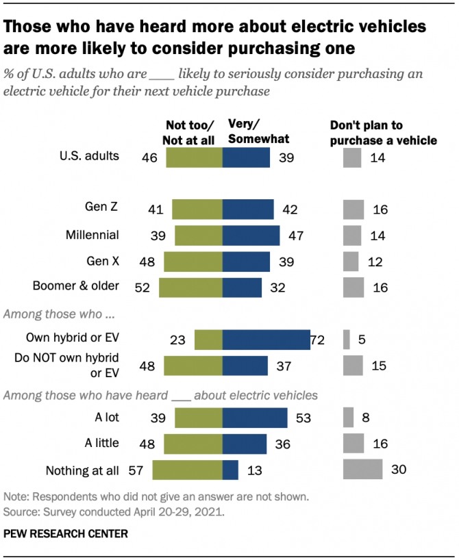 기존 내연기관 차량에서 전기차로 갈아타고 싶은 의향이 어느 정도인지를 여론조사기관 퓨리서치센터가 미국 소비자를 대상으로 최근 조사를 벌인 결과다.