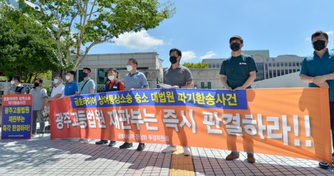 금호타이어 정상화 투쟁위원회가 지난해 8월 9일 오전 광주 동구 광주고법 앞에서 기자회견을 열고 금호타이어 통상임금 소송 파기환송심의 조속한 판결을 촉구하고 있다. 사진=뉴시스