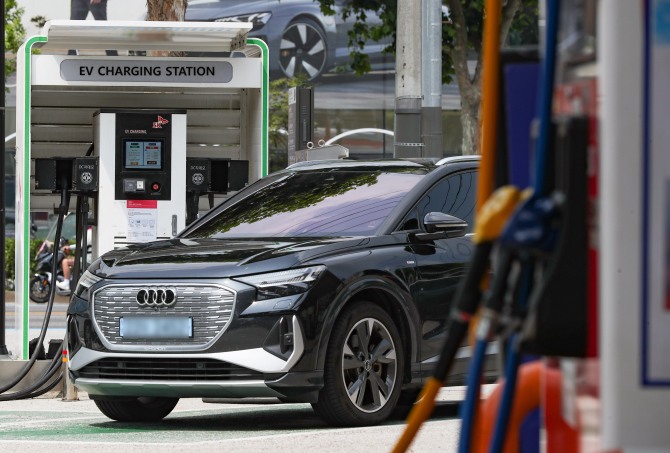 소방청이 지난 6월 29일부터 주유소 내 전기자동차 충전기와 주유기 사이에 6m 이상 거리를 둬야 했던 설치 기준을 일률적 거리가 아닌 '폭발 위험 장소 외 범위'로 설정했다. 이에 따라 부지가 협소한 도심 주유소에도 전기차 충전기 설치가 가능해 충전기 보급에 속도가 날 전망이다. 아우디 브랜드 순수전기차가 주유소 옆 전기차 충전소에서 충전하고 있다. 사진=뉴시스