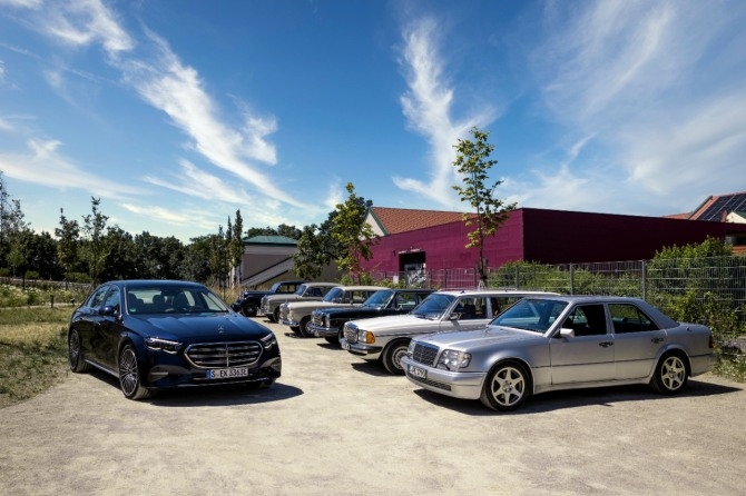 메르세데스-벤츠 E-클래스 W214(왼쪽), 뒤쪽부터 1~6세대 역대 모델 사진=메르세데스-벤츠코리아