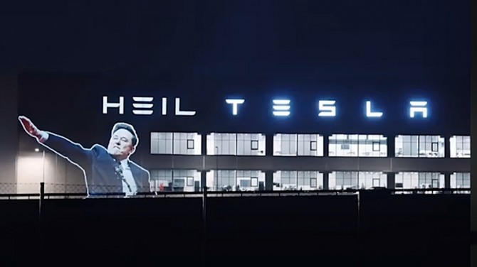 이미지 확대보기독일 정치 활동가들이 테슬라 베를린 기가팩토리에 일론 머스크가 나치식 경례를 하는 모습의 영상을 투사했다. 출처=유튜브