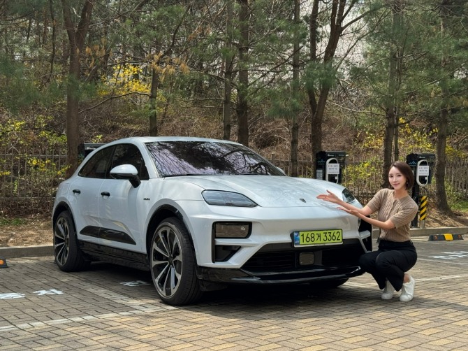 이미지 확대보기나연진 글로벌이코노믹 기자가 아이스 그레이 메탈릭 색상의 신형 포르쉐 마칸 일렉트릭 터보와 함께 포즈를 취하고 있다. 사진=나연진 글로벌이코노믹 기자