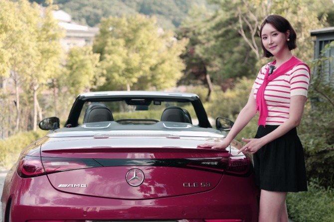 이미지 확대보기나연진 앵커가 지난 7일 '메르세데스-AMG CLE 53 4MATIC+ 카브리올레' 차량 시승 리뷰를 진행하고 있다. 사진=이병주 PD